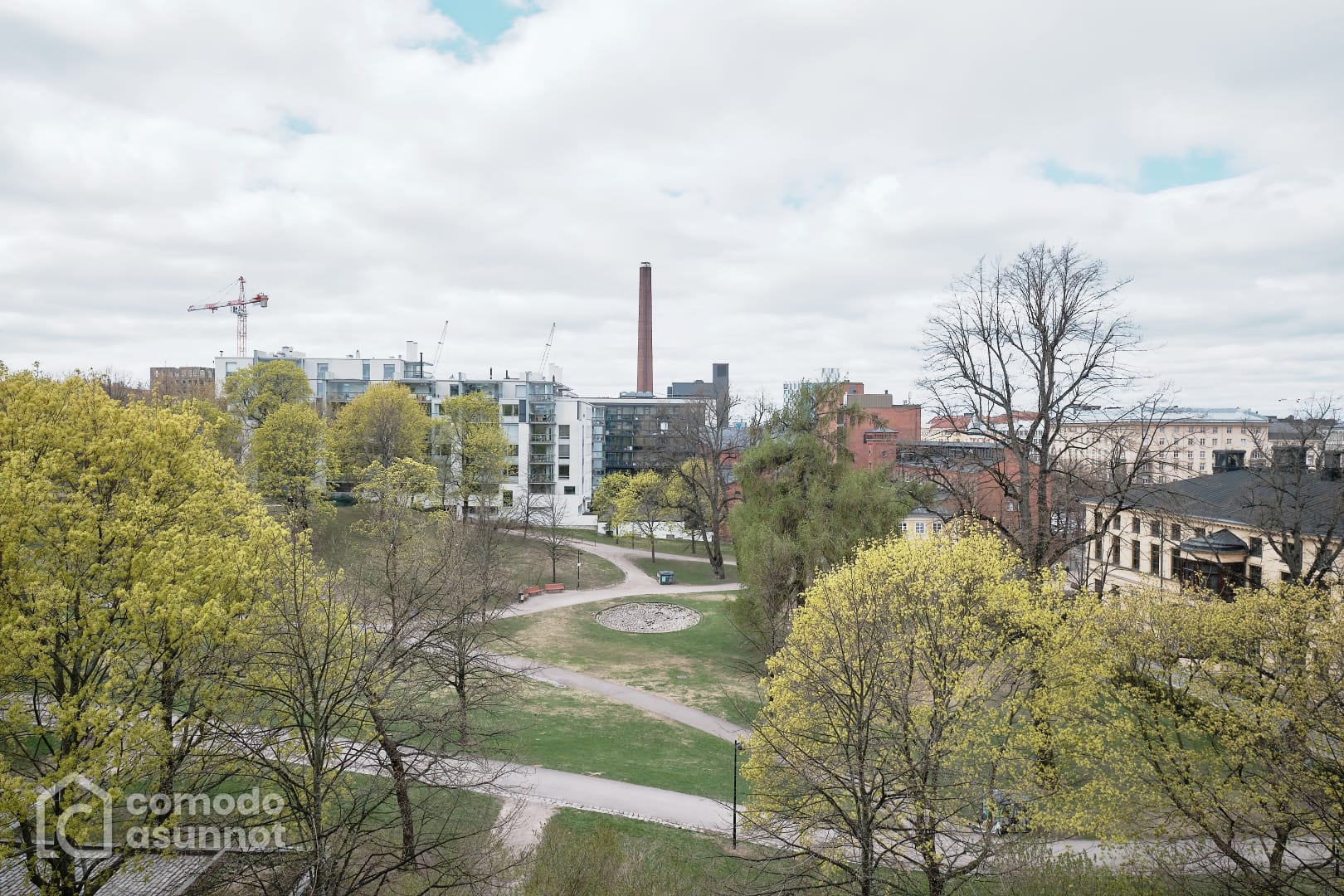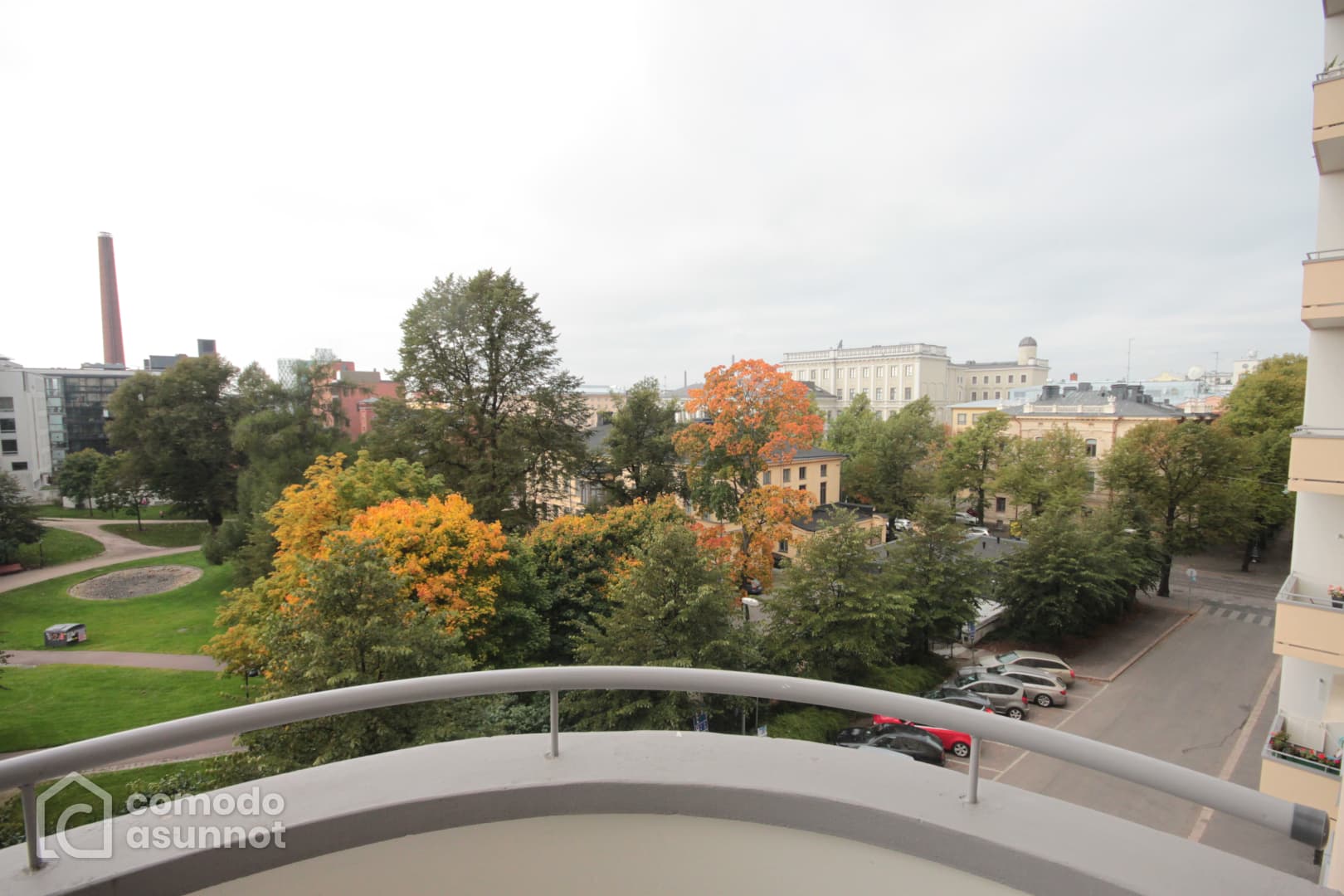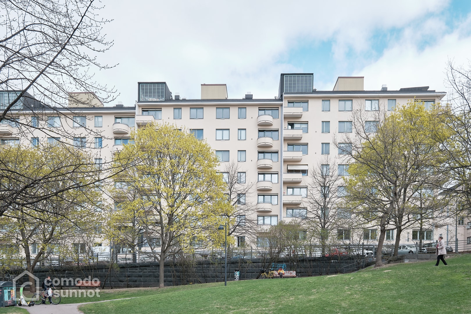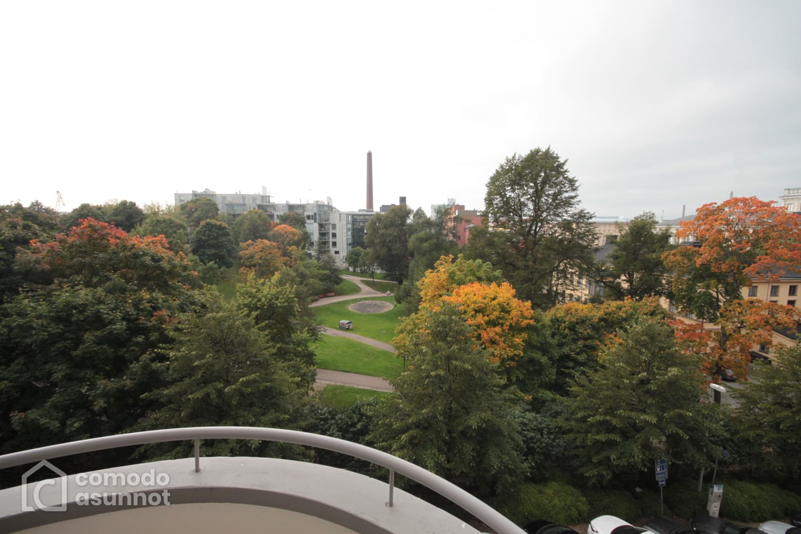 Luonnonvaloa tulviva asunto Sinerbrychoffin puistonäkymällä